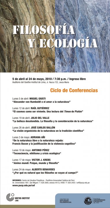 El lunes 17, es decir el próximo lunes, como parte del ciclo Filosofía y Ecología, estaré dando una charla en el Instituto Goethe a las 7:30pm. El título es “Anima Mundi: Psique, Mundo y Filosofía”. En cuanto tenga un momento colgaré un post sobre el asunto, pero quería ir avisándoles mientras tanto y antes de que se llenen de compromisos, para que lo agenden entre sus actividades, pues me gustaría mucho que me acompañen!