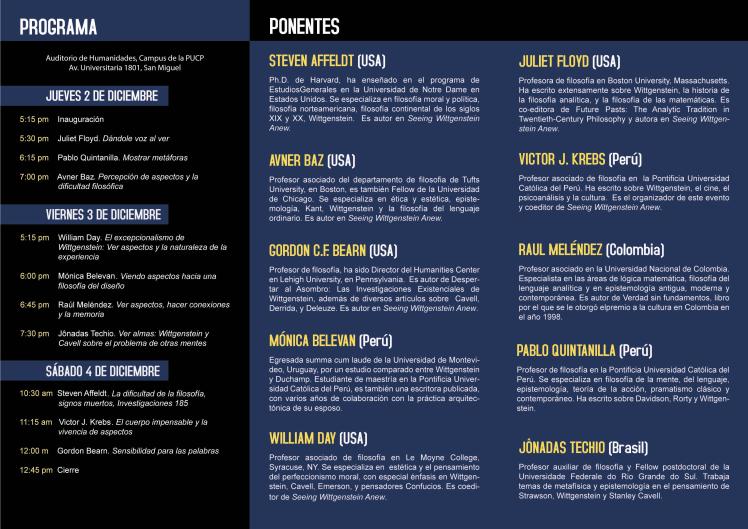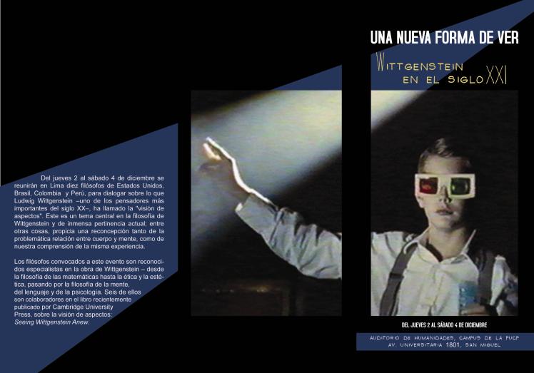 En tres semanas se realizará en Lima un coloquio con la participación de diez distinguidos filósofos de Estados Unidos, Colombia, Brasil y Perú en la PUCP. Estarán discurriendo sobre un tema de vanguardia en los estudios sobre la filosofía de Wittgenstein: La visión de aspectos.