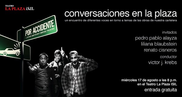 Este miércoles entrante, el 17 de agosto, continuaremos con el segundo episodio de las “Conversaciones en la plaza”. La obra de turno, Por accidente, es una exquisita comedia contemporánea y costumbrista, de Marisol Palacios y Alfonso Santistevan, que juega con las idiosincracias del peruano, y se convierte en la oportunidad para que en esta ocasión cuatro voces más conversen sobre los complejos, los prejuicios y los temores de cinco representativos hombres limeños, reunidos en la calle por un accidente.
