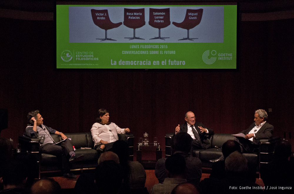 Durante los ultimos tres meses hemos tenido el placer de producir con el Goethe Institut y el Centro de Estudios Filosóficos de la PUCP una serie de conversaciones sobre el futuro que han versado sobre seis temas centrales de nuestra época que han encontrado una inusitada recepción. Hemos hablado sobre el fanatismo con Liuba Kogan y Jorge Bruce, sobre la sexualidad con Carlos Bruce y Natalia Iguiñiz, sobre la tecnología y el mundo virtual con Franciscco Sagasti y Abelardo Sánchez León, sobre la Naturaleza con Anna Zuchetti y Alberto Benavides y finalmente con Rosa María Palacios y Salomón Lerner Febres, sobre la democracia. Todas las veladas han sido no solo divertidas y amables sino además iluminadoras y llenas de semillas para la reflexión. Nos han confirmado estas semanas, que hay efectivamente en nuestra sociedad necesidad de espacios públicos de discusión informada, reflexiva e iluminadora, y que la filosofía tiene un papel que jugar más allá de la academia.